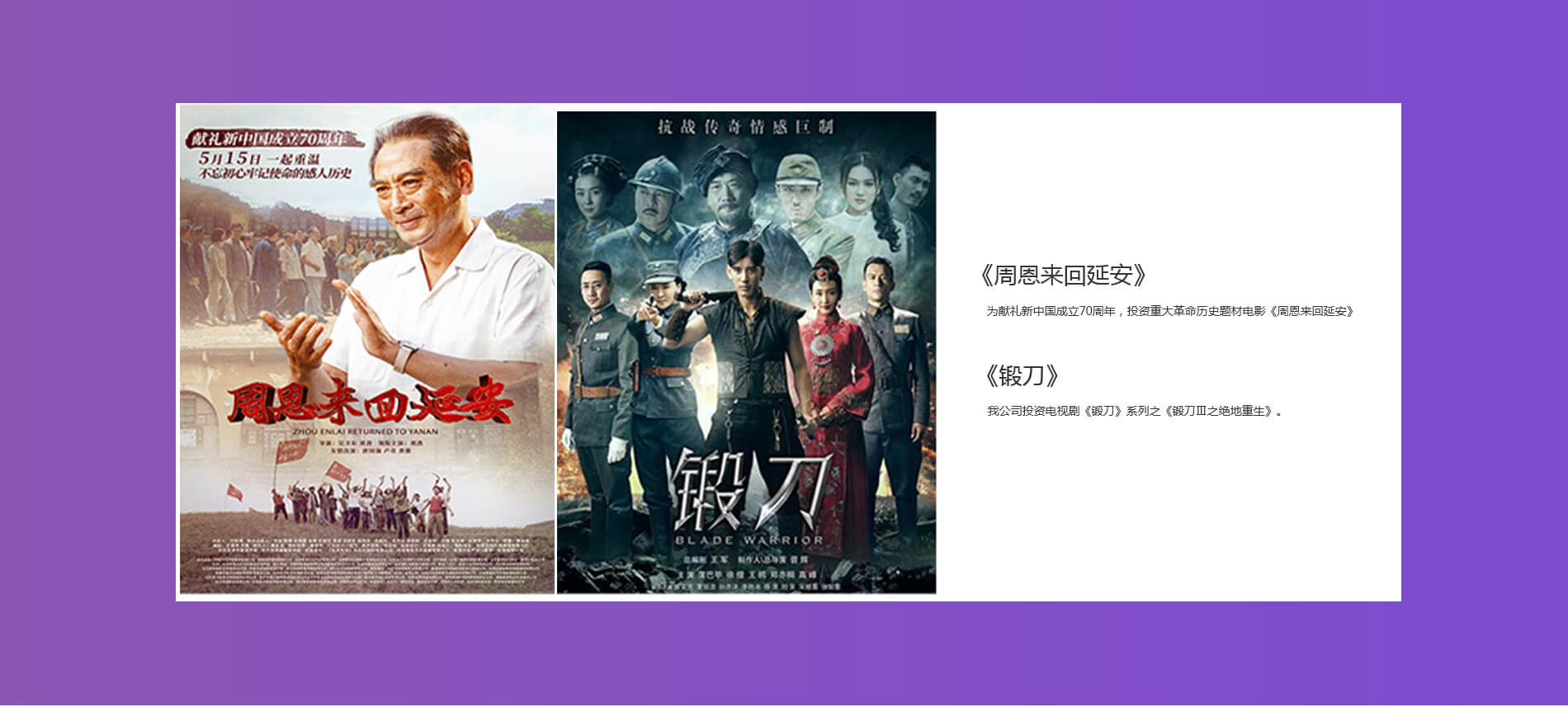 為獻(xiàn)禮新中國成立70周年,投資重大革命歷史題材電影《周恩來回延安》。2017年12月15日,電影項目啟動儀式暨新聞發(fā)布會在釣魚臺國賓館舉行。電影《周恩來回延安》從創(chuàng)作之初就受到了中宣部、文化和旅游部、中共中央文獻(xiàn)研究室、國家廣播電視總局等單位的關(guān)注和指導(dǎo),并得到了周恩來同志的親屬及他曾經(jīng)的秘書、警衛(wèi)等各界人士的大力支持。該片上映后受到社會各界的高度評價,不僅作為教學(xué)課程在中共中央黨校點映,還入選中宣部、教育部等聯(lián)合主辦的“看紅色電影,愛偉大祖國”優(yōu)秀電影進(jìn)校園系列活動播放影片。中宣部《黨建》雜志社更是召開以“弘揚周總理崇高精神,不忘初心、牢記使命”為主題的研討會,總結(jié)研討了該片的藝術(shù)成就、思想內(nèi)涵及現(xiàn)實意義。9月,該片獲得了第十五屆精神文明建設(shè)“五個一工程”獎。 《周恩來回延安》以1973年6月被檢查出患有癌癥的周恩來總理回到闊別二十六年的延安,延安的十三年往事歷歷在目,這方熱土養(yǎng)育了中國革命,養(yǎng)育了人民軍隊,形成了中國共產(chǎn)黨第一代領(lǐng)導(dǎo)集體,鑄就了中國共產(chǎn)黨的領(lǐng)導(dǎo)地位。演繹一代偉人對人民的深情牽掛,講述周恩來總理時隔26年回到革命圣地延安的短暫22小時,謳歌中國共產(chǎn)黨與人民血肉相連及不忘初心、不懈奮斗、砥礪前行的偉大精神。 影片上映以來,人民網(wǎng)、新華網(wǎng)、央視網(wǎng)等核心官方媒體紛紛給予肯定評價,好評如潮,可見影片影響之轟動和廣泛。